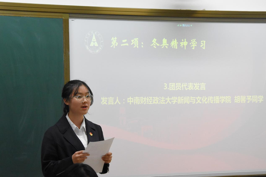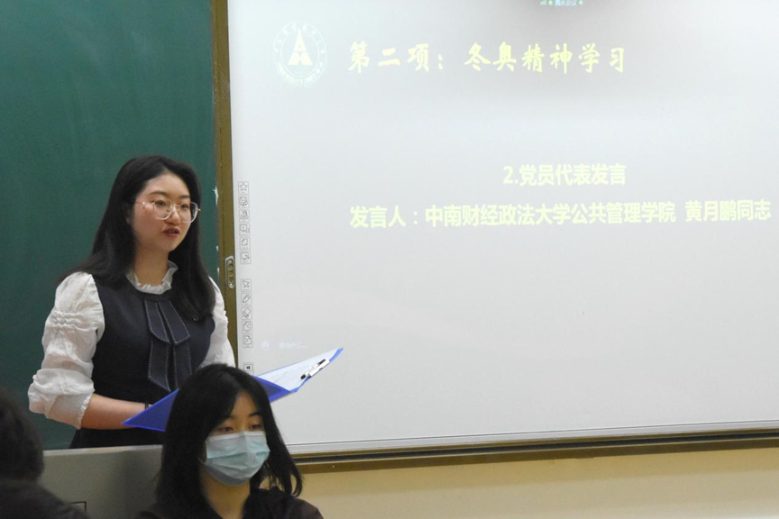 会议第三项,我校研究生党员代表黄月鹏同志、团员代表胡馨予同学分别做分享发言。黄月鹏从“什么是冬奥精神”以及“如何发扬冬奥精神”两个维度出发,向大家发出号召:学习和发扬运动员吃苦耐劳的拼搏精神、增强文化自信心和民族自豪感、提高开放包容意识和树立全球价值观,呼吁青年研究生党员和团员以青春筑梦想,以奋斗谱华章;胡馨予同学以中国共产党和中国共产主义青年团的紧密关系切入,表达了新时代青年应该胸怀理想、志存高远,不断向党组织靠拢,早日成为一名合格的共产党员的决心和信心。