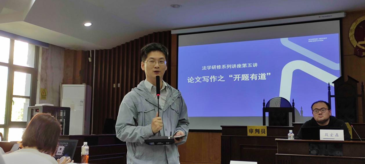 随后,段老师以“法学研究生学位论文开题经验与写作技巧”为主题展开了详细讲解。段老师首先强调了问题意识的培养与塑造,他通过一系列论文标题范例帮助同学们理解论文选题中的问题意识;在此基础上,段老师对“开题是在开什么”这一问题从选题价值、研究思路方法以及大纲的确定、写作风险与困难预估、选题大小等方面进行阐释;随后,段老师介绍了论文结构安排的要求,指出论文结构应当具备直观性、学术性与逻辑性,大纲设计应该兼具直观性与深刻性;最后,段老师指导同学们如何规划论文写作,具体包括整体写作节奏的把握、文献资料的利用、文字表达能力的训练等内容。