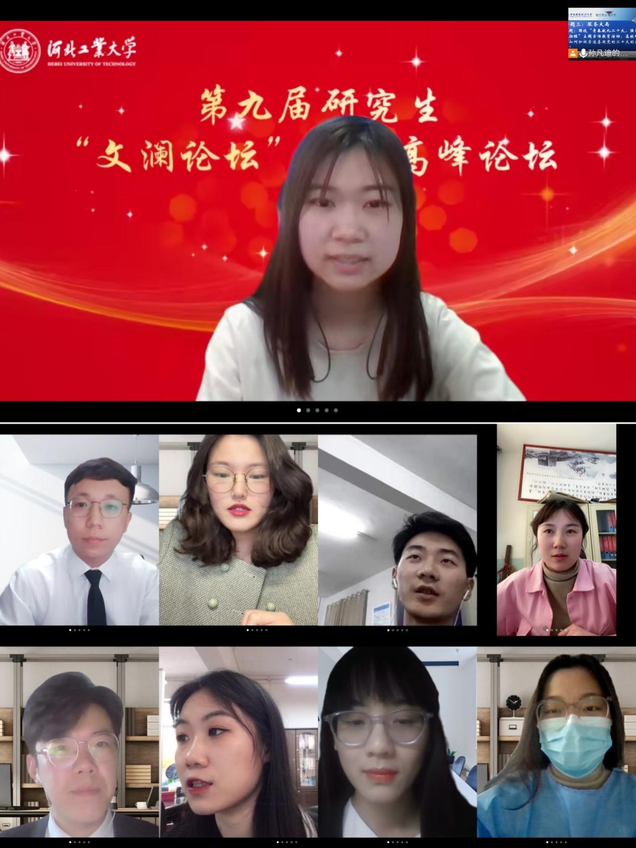 专题三以线上讨论的方式顺利开展。秦佳莹(河北工业大学)指出可以开设宣传专栏,为喜迎党的二十大召开营造浓厚氛围;卢菁(湖北大学)认为应分层推进理论学习,切实保障理论指导实践;颜瑜(华中师范大学)强调应结合疫情防控开展主题社会实践活动,创新理论宣传形式;梁霜晨(南京财经大学)建议通过官方公众号报道优秀党员事迹,引导研究生从朋辈力量中锤炼党员先进性;王嘉楠(三峡大学)强调推动党史学习教育常态化,重在坚持思想领航;谢林廷(广州大学)提出应发挥院际联动作用,及时向广大研究生传达党的声音和主张;曹云鹏(山东财经大学)建议可以通过开展主题征文、主题演讲比赛等活动迎接和学习宣传党的二十大;盛婕妤(上海财经大学)认为可以邀请研究生支教团就社会服务这一主题进行宣讲,号召广大研究生以实际行动献礼党的二十大;杨星(武汉工程大学)认为应拓宽思想传播的载体和渠道,发挥新媒体矩阵作用,营造喜迎党的二十大的浓厚氛围;马鑫淼(北京外国语大学)认为应结合青年论坛搭建宣传平台;李梓桤(武汉理工大学)认为可以依托“三会一课”拍摄主题宣传片;丁欢(西南财经大学)则认为可以开展经典阅读活动;孟博(中央民族大学)提出要组织党的二十大精神集中学习,铸牢中华民族共同体意识;白雪(石河子大学)强调了树立典范对传承红色血脉的重要作用;解子藤(重庆大学)认为可以组织实践团队,依托红色教育资源开展党史学习教育。
