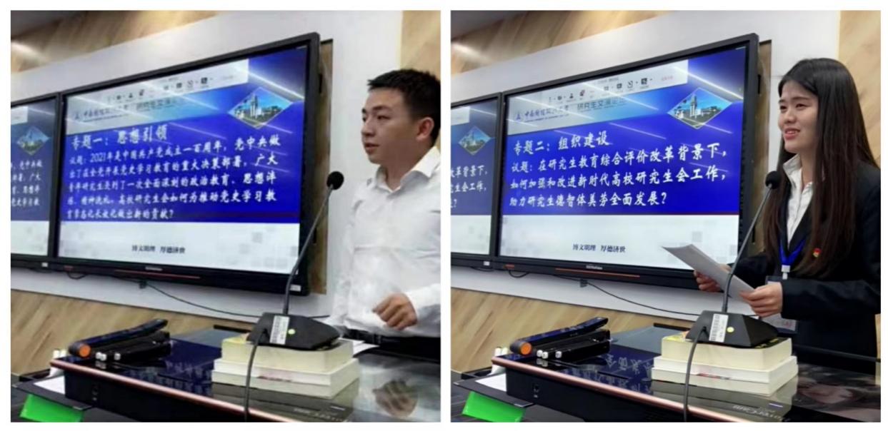 对于专题一,徐高铮(武汉大学)指出党史学习教育必须紧紧依托党支部开展集中学习活动,提高学习实效;段雨阳(武汉科技大学)认为组织开展情景化、系列化活动是营造良好学习氛围的有效举措;李雅倩(武汉科技大学)重点强调新媒体平台在党史学习教育宣传方面的重要作用;吴昊(湖北经济学院)建议结合校史馆、档案馆等红色教育场馆开展校内特色学习活动;刘瑞帆(华中农业大学)则从时效性的角度,提出要抓住关键时间节点开展党史学习教育;此外,我校多个学院(中心)研究生会代表也提出通过微党课、艺术表演、主题展览等活动,进一步推进党史学习教育常态化长效化。