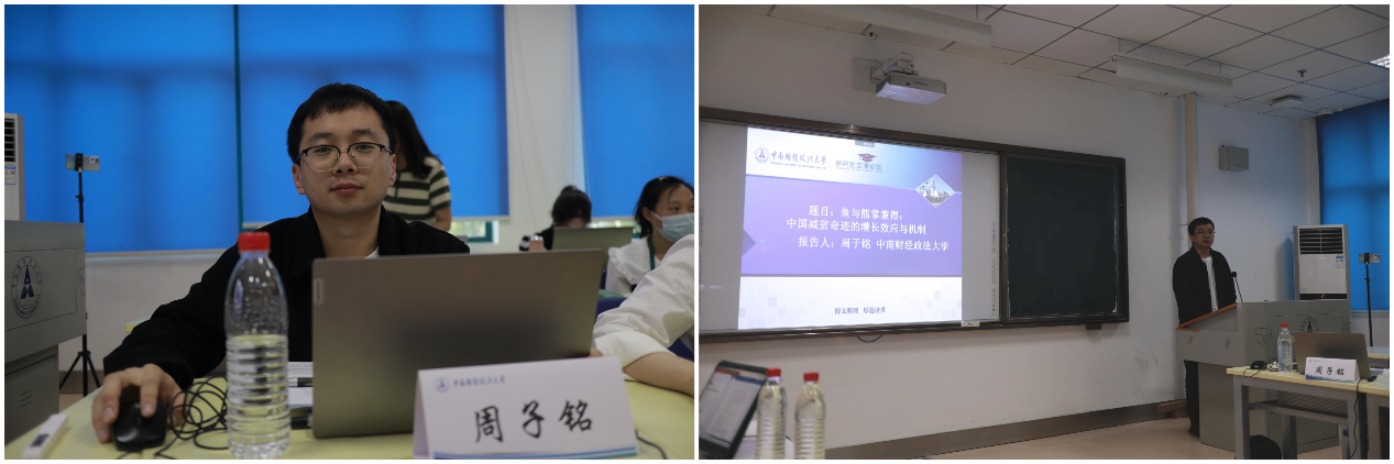 中南财经政法大学博士研究生周子铭报告了论文《鱼与熊掌兼得:中国减贫奇迹的增长效应与机制》,他指出贫困对经济增长具有显著的抑制作用,证实了减贫对我国经济增长的推动作用与包容效应,展现出中国面向未来的经济增长路径。两位点评嘉宾分别对三位报告人的论文进行了点评,就研究框架、研究设计、研究内容等方面提出了优化建议,并对部分论文创新性增加提出了宝贵的建议。