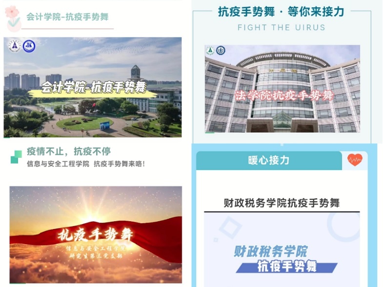 “抗疫手势舞”由各学院研究生党支部拍摄,研究生会公众号进行宣传展示,共有法学院、哲学院、会计学院、数学与统计学院、金融学院、工商管理学院、财政税务学院、信息与安全工程学院8个学院参与其中,各学院之间积极分工,相互配合,最终顺利完成此次接力活动。各学院分别通过宣传防疫志愿故事、分享防疫小贴士、抒发抗疫感悟等形式号召师生们坚守防疫阵线、珍惜抗疫成果,在疫情中沉心静气,守住自觉和担当。从各学院抗疫宣传活动中,我们可以感受到中南大青年党员们用一个个手势展现的真挚祝福和传递的一份份真心。