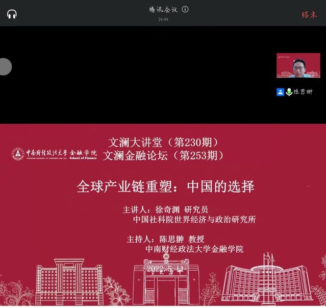 (通讯员 范媛 李鑫汝)5月11日下午14:00,金融学院第235期文澜金融论坛暨第230期“文澜大讲堂”之名家讲坛在线上顺利举行。本期论坛分享的主题是“全球产业链重塑:中国的选择”,主持人为金融学院陈思翀教授,主讲人为中国社科院世界经济与政治研究所研究员、博士生导师徐奇渊,学院师生共200余人参与此次讲座。