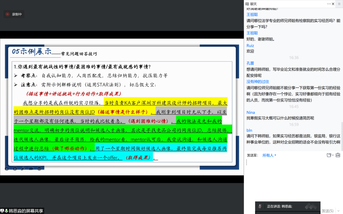 法律硕士教育中心2019级研究生王婵媛同学,现签约于中海地产。她结合个人就业经历从实习、简历投递、面试准备等方面大家提供了求职指导。王婵媛同学谈到,为了平衡就业和学习,毕业论文的写作一定要趁早准备,多借助excel等工具厘清“行业、岗位、城市、薪资”等指标的重要度以及多岗位投递时的节点跟进问题,多复盘,总结经验,做好整体职业规划。