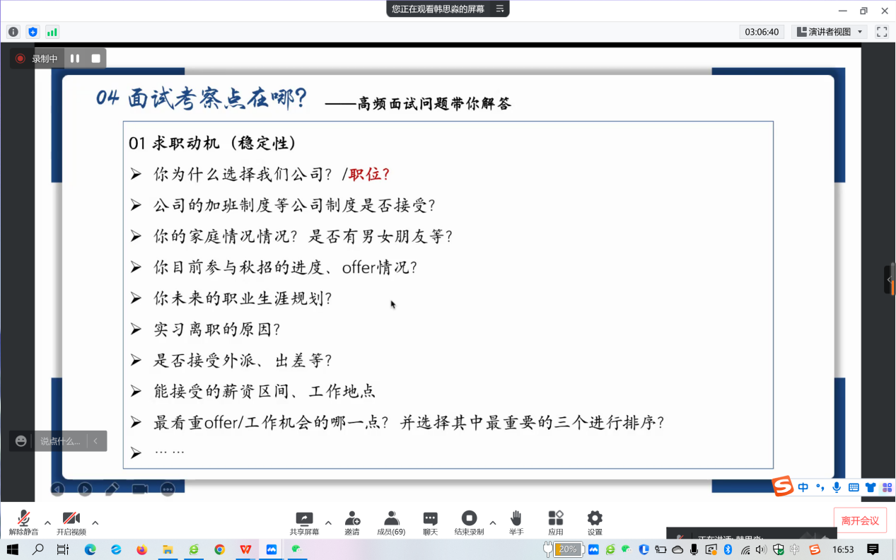 外国语学院2020级研究生韩思淼同学,现签约于腾讯深圳总部。她给大家分享了互联网企业的求职经验和心得。韩思淼同学从就业规划及准备、简历制作和面试攻略三个方面展开分享,以自己在面试时的经历生动形象地为同学们传授应试技巧,让同学们受益匪浅。