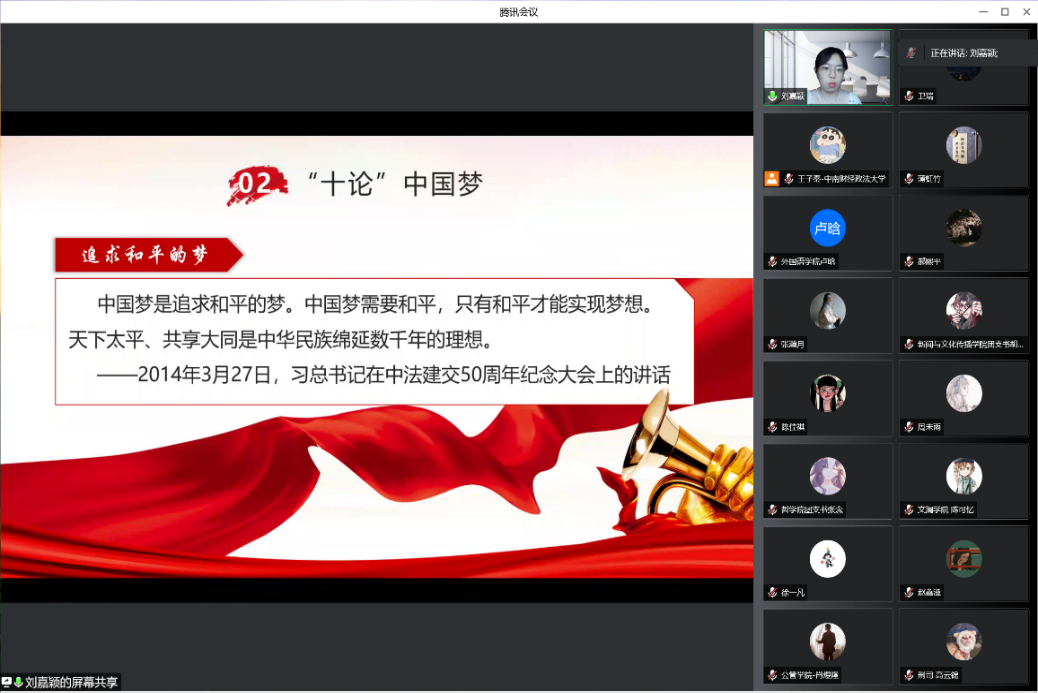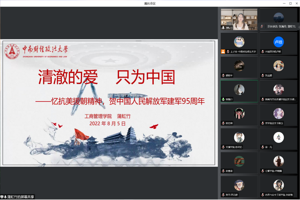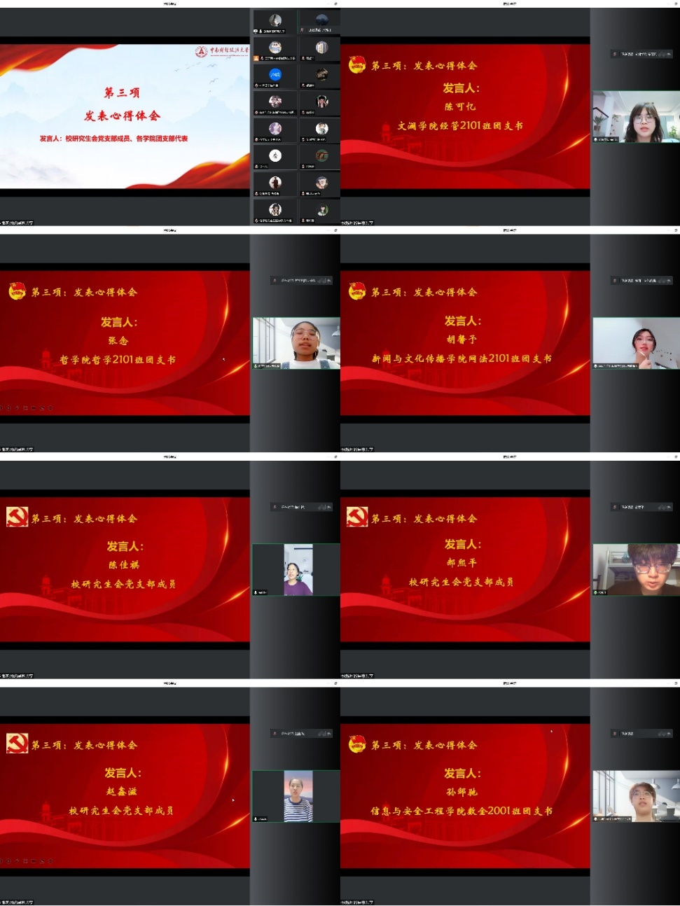 8月5日晚,校研究生会党支部成员以及结对团支部团员代表相聚云端进行交流学习,同时校研究生会党支部支委也特别邀请了校研究生党员理论宣讲团成员刘嘉颖、蒲虹竹共同参与交流并开展主题宣讲。交流会由校研究生会党支部成员张瀚月同志主持。