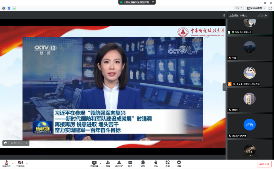 交流会伊始,大家共同观看了中共中央总书记、国家主席、中央军委主席习近平7月27日前往中国人民革命军事博物馆,参观“领航强军向复兴——新时代国防和军队建设成就展”的新闻片段。总书记强调要贯彻新时代党的强军思想,贯彻新时代军事战略方针,再接再厉,锐意进取,埋头苦干,奋力实现建军一百年奋斗目标,不断开创强军事业新局面,为实现中华民族伟大复兴提供战略支撑。大家纷纷表示,没有革命先烈为民族独立所做出的牺牲,没有新中国成立以来党带领人民开展的一系列国防建设,就没有今天我们所取得成就,因此我们要百倍地珍惜今天,铭记一代又一代革命前辈做出的贡献,更要发扬他们的精神,为实现中华民族伟大复兴的中国梦继续奋斗。