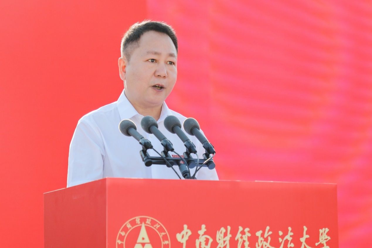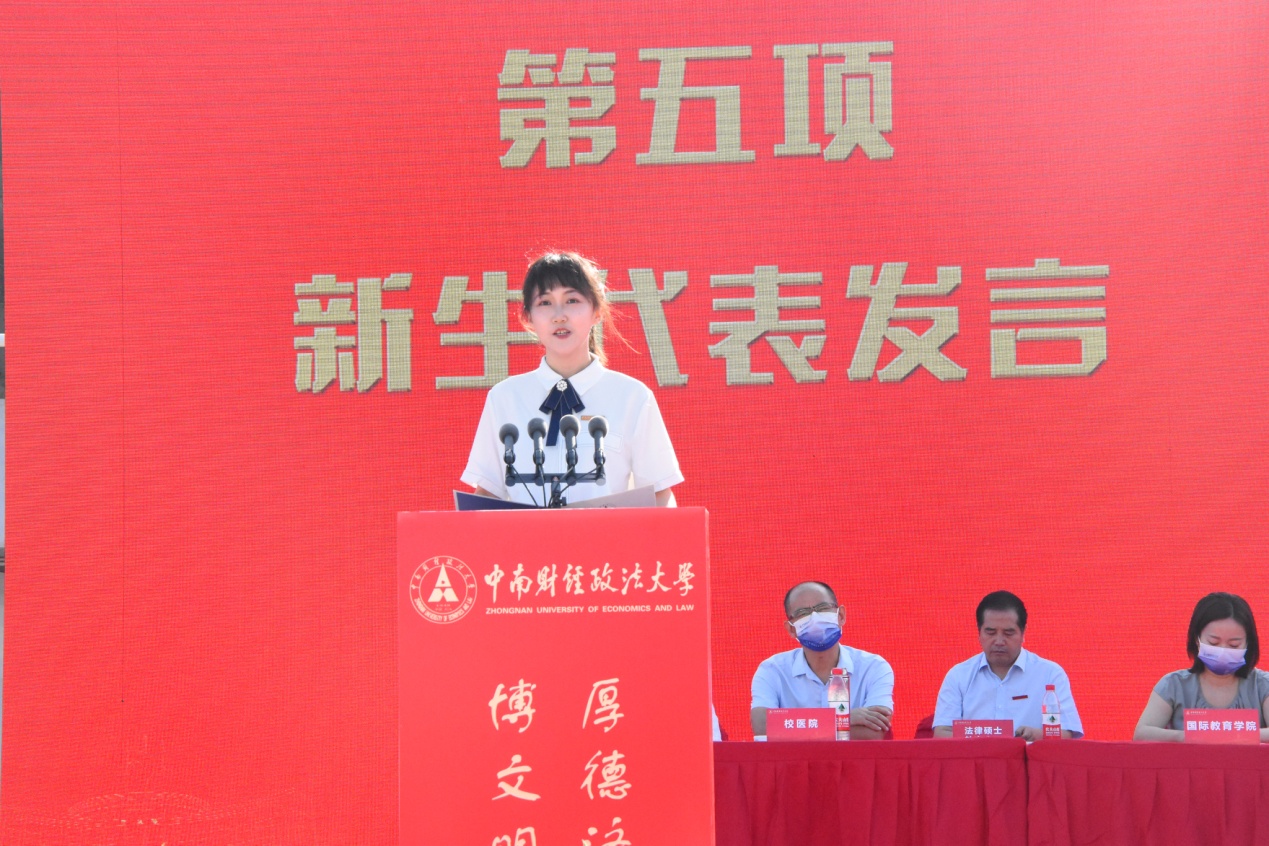 杨灿明校长以“在青春的赛道上尽情奔跑”为主题致辞。杨校长代表学校向9200多名新生的到来表示热烈欢迎,向辛勤培育新生成长成才的家人师长表示衷心感谢。杨校长表示,中南财经政法大学是一所具有鲜明红色基因的革命大学,70多年来,中南大“由党创立、建校为党、成长为国、发展为人民”的红色基因始终一脉相承。围绕同学们即将在中南大度过的青春时光,杨校长通过分享我校潘梓年校长、郑小瑛、陈闵健校友的事迹,向新生们提出了几点希望:第一,追求进步,以坚定的理想信念引领人生前进的方向。杨校长向新生讲述了著名哲学家、杰出的新闻斗士潘梓年老校长的故事,希望同学们始终保持青春最宝贵的特质,把个人理想融入中国特色社会主义共同理想,毕业后“走向人民需要的地方”。第二,追逐梦想,以持久的笃学笃行敢于追梦、勤于圆梦。杨校长以中国第一位交响乐女指挥家郑小瑛的圆梦历程为例,鼓励同学们始终保持青春最难得的坚持,励志勤学、敏思善学、笃行学乐。第三,砥砺德行,以深厚的家国情怀涵养当代青年的高尚品德。杨校长分享了我校会计学院2000级校友陈闵健的扶贫故事,希望同学们始终保持青春最美好的品质,明大德、守公德、严私德,做崇德向善的新时代好青年。杨校长表示,2022级新同学们亲身感受了“中国速度”“中国奇迹”“中国之治”,是最有理由自信的新时代青年,希望同学们带着自信之心、坚强之心、进取之心,共同参与实现第二个百年奋斗目标,在充满无限可能的大学校园里,勇敢地追求探索,在青春的赛道上奋力奔跑,用奋斗在中南大书写精彩乐章。