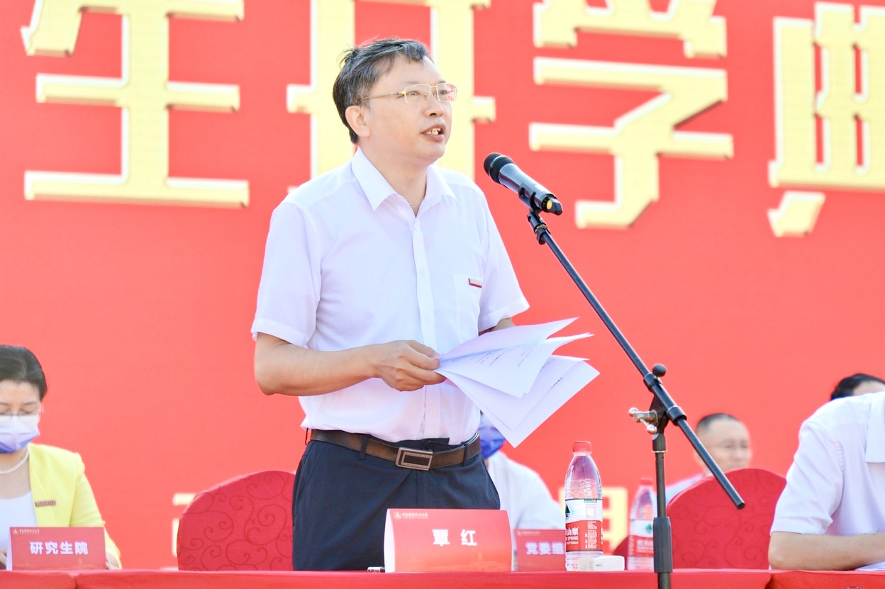 (通讯员 付慧娟 黄丽琼 张瀚月 胡素莉 摄影 黄媛媛 孔繁溪)金秋九月,丹桂飘香。9月14日上午8时,我校2022级南湖校区新生开学典礼在体育运动中心隆重举行。校党委书记栾永玉,校党委副书记、校长杨灿明,校党委副书记陈明,校党委副书记、纪委书记侯振发,校党委常委、副校长覃红,校党委常委、副校长姚莉,校党委常委、副校长刘仁山,副校长邹进文,校党委常委、副校长申祖武,校党委常委、副校长周铭山,校党委常委、党委宣传部部长兼马克思主义学院院长周巍,承训部队代表杨先文中队长以及相关职能部门负责人、各学院(中心)负责人、辅导员出席典礼。全体2022级研究生新生及相关学院2022级本科生新生共5000余人参加典礼。典礼由覃红副校长主持。