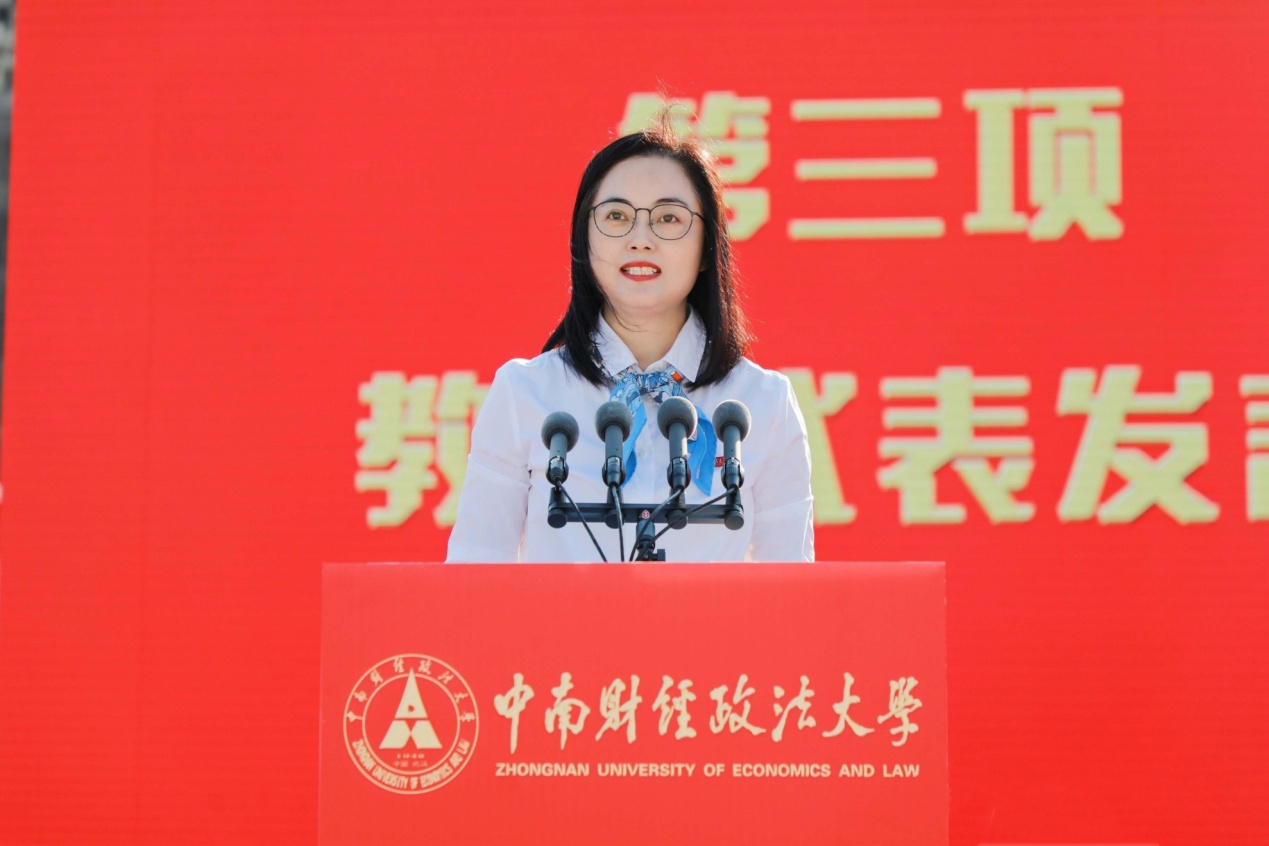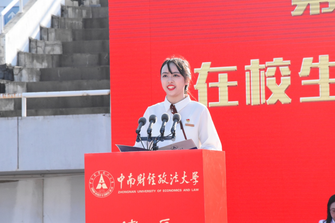 第38届校研究生会执行主席、法学院2021级诉讼法学专业硕士研究生温晖蕾作为在校研究生代表发言。她回顾了与中南大一起度过、一同成长的六年春秋,见证了全体师生围绕“建设财经政法深度融通特色鲜明的世界一流大学”新时代发展战略目标凝心聚力、锐意进取的发展奋进之路,希望同大家一起在中南大浓厚的学习科研氛围中,领悟“博文明理弦歌不辍,厚德济世初心不改”的精神,以青春之我讲述青春之奋斗,努力成长为堪当民族复兴重任的时代新人。