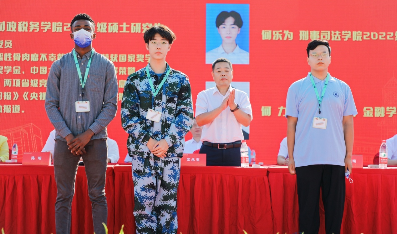 校徽是学校的重要标志和象征,是学校办学理念、办学特色以及文化的深刻凝练和艺术体现。在典礼上,栾永玉书记为来自财政税务学院 2022级税务专业硕士研究生王晨,刑事司法学院2022级本科生何乐为,金融学院2022级硕士研究生、科特迪瓦籍留学生何力颁发中南财经政法大学校徽。他们将带着学校的殷切期望,以更强烈的主人翁意识和集体荣誉感,在中南大开启人生新篇章,度过快乐充实的求学生涯。