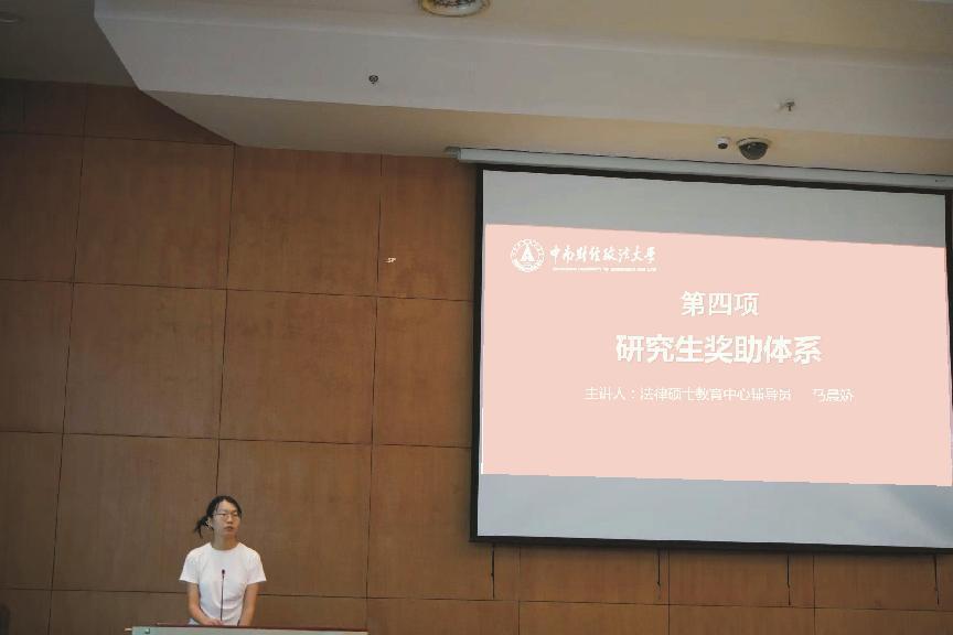 马晨娇老师就研究生奖助体系进行了介绍。她依次介绍了国家奖学金、学业奖学金、助学金、科研与实践奖励、学年评优、专项奖学金、“三助”酬金、特殊困难补助等奖助学金取得的条件和标准。