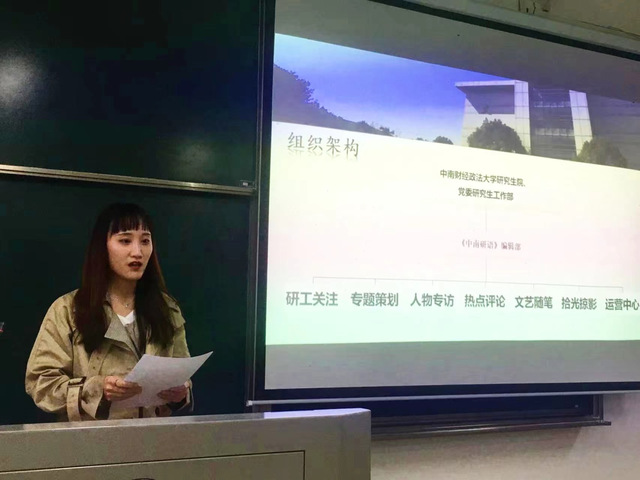 接下来,《中南研语》编辑部执行主编刘英俊同学发言。她代表《中南研语》编辑部对加入的新成员表示欢迎,并对《中南研语》编辑部的组织架构和版块(部门)职责进行了详细介绍和展示。谈及未来的工作开展,她提出以下想法与编辑部成员共勉:坚持推进文化建设,提高思想水平;坚持创新刊物内容,保障刊物质量;坚持加强团队建设,完善制度规范。