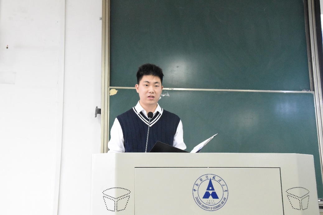 随后,第三十八届校研究生会主席团成员代表王子秦同学发言。他代表校研究生会对新成员的加入表示欢迎,对校研究生会的宗旨、工作目标和工作内容进行了介绍,并希望自己能以身作则,做到学思践悟、履职尽责、不忘主业、扎实作风,与新成员们共同传承学校红色基因,发扬主人翁精神,为学校的“双一流”建设贡献力量。