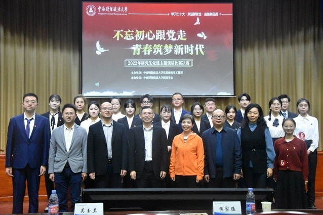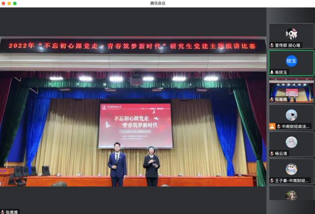 (通讯员 付慧娟 黄丽琼 吴润泽 朱湛昀 摄影 胡雪涵 贺兰兰)为深入学习宣传贯彻党的二十大精神,进一步引导广大研究生深刻领悟“两个确立”的决定性意义,增强“四个意识”、坚定“四个自信”、做到“两个维护”,丰富研究生党建活动形式和载体,展现研究生群体奋发向上的精神风貌,党委研究生工作部于11月3日14:30在文泉楼报告厅举行“不忘初心跟党走·青春筑梦新时代”研究生党建主题演讲比赛决赛。新闻与文化传播学院吴玉兰教授、马克思主义学院黄家猛教授、党委研究生工作部肖翠祥部长、党委组织部陈金川副部长、党委宣传部熊灯副部长、校团委大学生艺术美育中心刘诗卉老师受邀出席并担任评委。根据疫情防控相关要求,本场比赛采取线上线下相结合的形式,以网络视频方式在线实时直播,不设置现场观众席,各学院(中心)研究生通过线上方式观看。