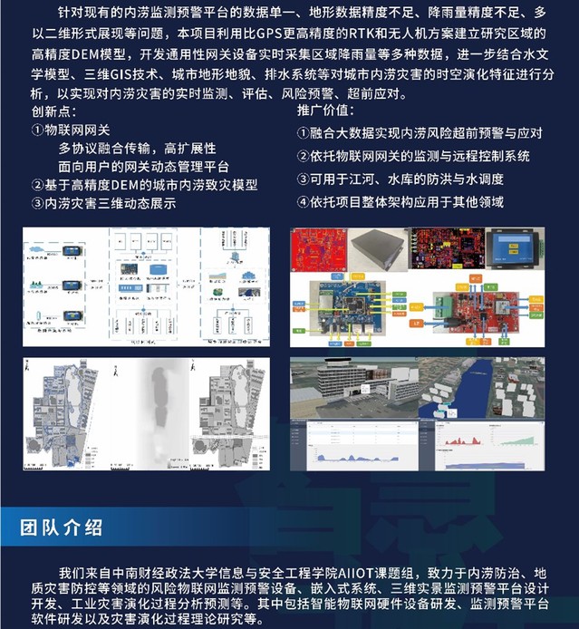 信息与安全工程学院研究生李琨、王怡、刘融港,在杜建华、陈子鹏老师指导下将AIIoT课题组在物联网监测装备、物联网监测系统集成、三维GIS预警系统等领域的技术成果,应用于三维城市内涝灾害的监测预警。该作品针对现有的内涝监测预警平台的数据单一、地形数据精度不足、降雨量精度不足、多以二维形式展现等问题,利用比GPS更高精度的RTK和无人机方案建立研究区域的高精度DEM模型,开发通用性网关设备实时采集区域降雨量等多种数据,进一步结合水文学模型、三维GIS技术、城市地形地貌、排水系统等对城市内涝灾害的时空演化特征进行分析,以实现对内涝灾害的实时监测、评估、风险预警、超前应对,实践价值与学科应用价值较强,充分体现了我院的学科优势与学子风采。
