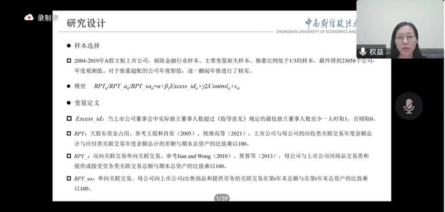 首先,全怡副教授介绍了独立董事的制度背景与选聘动机。她从董事会“独董超配”这一现象入手,以大股东超配独立董事的动机为逻辑起点,以我国2004-2019年A股主板上市公司为研究对象,详细讲解了独立董事在董事会中的构成是否会影响大股东隧道挖掘行为以及对公司整体效果的影响。接着,老师从掏空动机、掏空阻力两方面,检验不同环境下独董超配的上市公司大股东掏空程度差异。