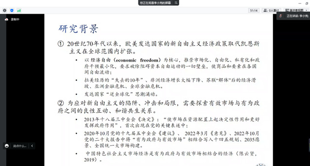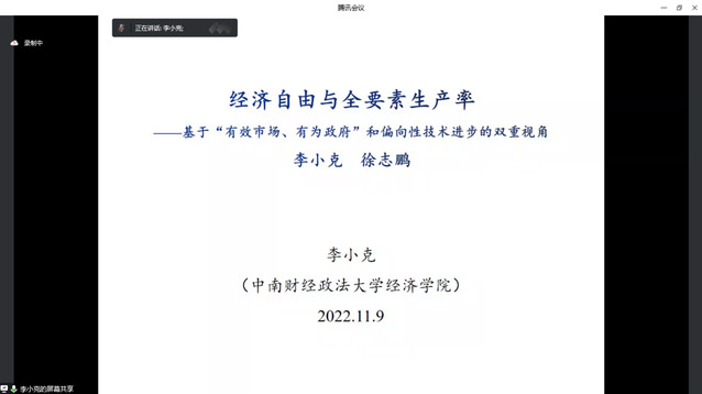 (通讯员 岳明泽)为加强校园学术氛围,进一步传播前沿的学术思想和优秀的学术成果,同时配合校园防疫要求,经济学院研究生会于2022年11月9日晚以线上形式成功举办了主题为“经济自由与全要素生产率”的讲座。本次讲座的主讲人为经济学院李小克副教授,170余名研究生在线参加。