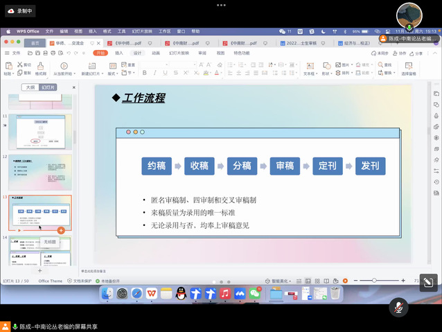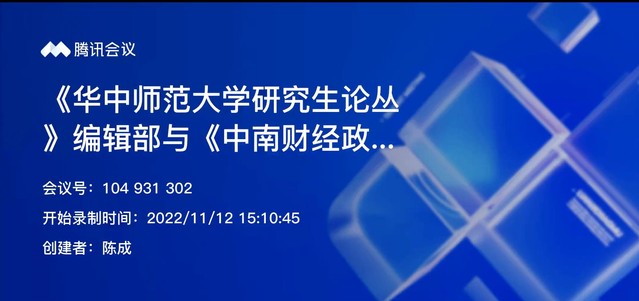 (通讯员 曹宇 叶金莎)2022年11月12日下午3时,《中南财经政法大学研究生论丛》(以下简称《中南大研论丛》)编辑部与《华中师范大学研究生论丛》(以下简称《华中师大研论丛》)编辑部办刊经验交流会在线上举行。此次交流会以“研究生自办刊物办刊经验交流”为主题,参会人员为《中南大研论丛》编辑部编委会现任骨干成员和上届副主编、《华中师大研论丛》编辑部编委会全体成员。会议由《中南大研论丛》编辑部副主编陈成和《华中师大研论丛》编辑部执行主编孙丹红共同主持。