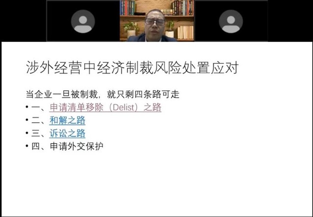 第四部分,简教授结合成功案例介绍了涉外经营中经济制裁的风险处置应对方略。企业一旦被制裁,就只剩以下四条路可走:申请清单移除之路,和解之路,诉讼之路和申请外交保护。