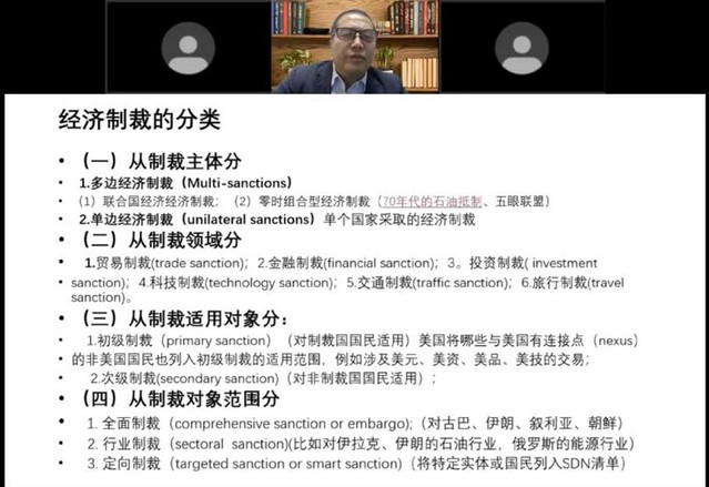 第一部分,简教授界定了经济制裁的概念,举例说明了经济制裁的分类,介绍了与企业经营者息息相关的三种经济制裁新变化——法律保障性衰减、效力范围向境域外扩展和对象的定向性不断增强,即经济强制、域外经济制裁和聪明制裁,并分别结合具体事件进行了深入讲解。