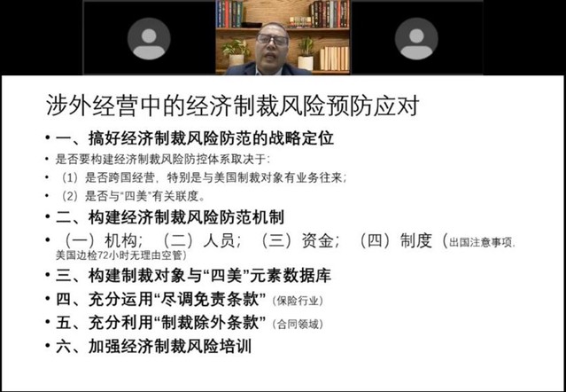 第三部分,简教授介绍了涉外经营中经济制裁的风险预防应对方略,主要包括以下六个方面:明确经济制裁风险防范的战略定位,构建经济制裁风险防范机制,构建制裁对象与“四美”元素数据库,充分运用“尽调免责条款”,充分利用“制裁除外条款”和加强经济制裁风险培训。