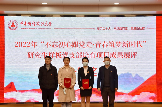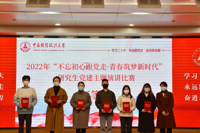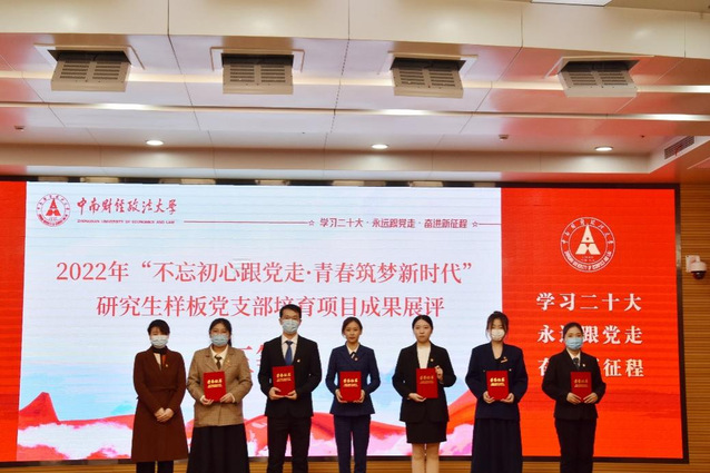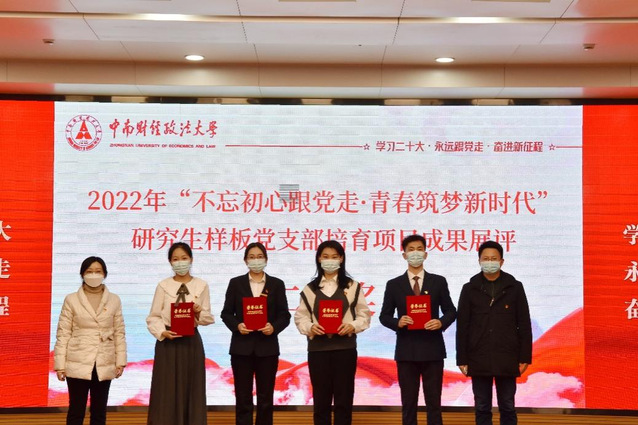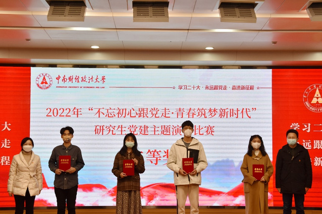 经过评选,哲学院研究生第三党支部和法学院2021级研究生国际法党支部荣获一等奖;马克思主义学院研究生第二党支部、文澜学院研究生第二党支部、会计学院2021级会硕第二党支部、工商管理学院博士研究生第三党支部荣获二等奖;外国语学院研究生第二党支部、统计与数学学院学硕第一党支部、法律硕士教育中心2104班学生党支部、信息与安全工程学院研究生第三党支部、金融学院研究生2021级金融工程党支部和财政税务学院学术硕士第一党支部获得三等奖。领导嘉宾们分别为获奖支部颁奖并合影留念。