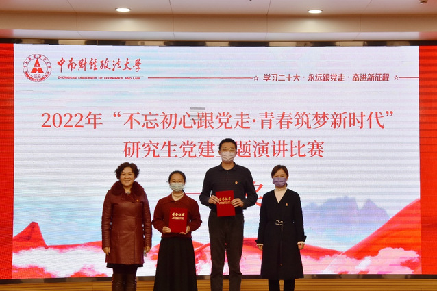 今年以来,学校开展“青春献礼二十大,强国有我新征程”迎接学习宣传党的二十大主题宣传教育活动。党委研究生工作部持续开展“不忘初心跟党走·青春筑梦新时代”研究生党建品牌建设系列活动,其中2022年研究生党建主题演讲比赛决赛于11月3日落下帷幕(时因疫情防控要求,现场未设观众席)。展评会现场特别设置温馨颁奖环节,领导嘉宾们分别为研究生党建主题演讲比赛一等奖、二等奖、三等奖获奖选手颁奖并合影留念。