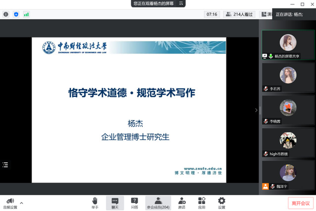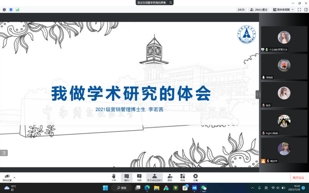 此次活动特邀我院具有丰富科研成果的的研究生代表2022级企业管理专业博士研究生杨杰同学和2021级营销管理专业博士研究生李若茜同学结合自身科研经验进行了分享,杨杰同学曾发表SSCI,CSSCI论文各一篇,主持中南财经政法大学研究生科研创新项目两项,曾参与国家社会科学基金一般项目、教育部人文社会科学研究项目等多项课题研究;李若茜同学曾发表CSSCI论文两篇,主持并成功结项中南财经政法大学研究生科研创新项目,研究方向为消费者行为。