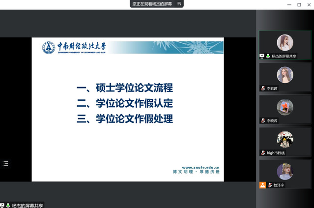 硕士学位论文流程部分。杨杰同学详细介绍了开题答辩、预答辩和学位答辩三个主要环节,提醒同学们预答辩未通过的论文不能正式进入答辩,需要提高对于预答辩的重视程度,而后对盲评和抽检这两个重点部分进行了详细的阐释。在学位论文作假认定部分。杨杰同学介绍了《中南财经政法大学学位论文作假行为处理办法》中作假行为的5类主要情形,以及八种论文作者学术不端行为类型。在学位论文作假处理部分,杨杰同学通过对《中南财经政法大学学位论文作假行为处理办法》的讲解,强调了科研活动中实事求是的重要性,希望大家能够秉持科学严谨的治学态度,恪守学术诚信,遵守学术准则。