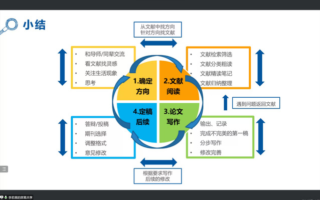随后,李若茜同学以“我做学术研究的体会”为题进行分享,从写论文前、写论文中、写论文后三个维度展开。