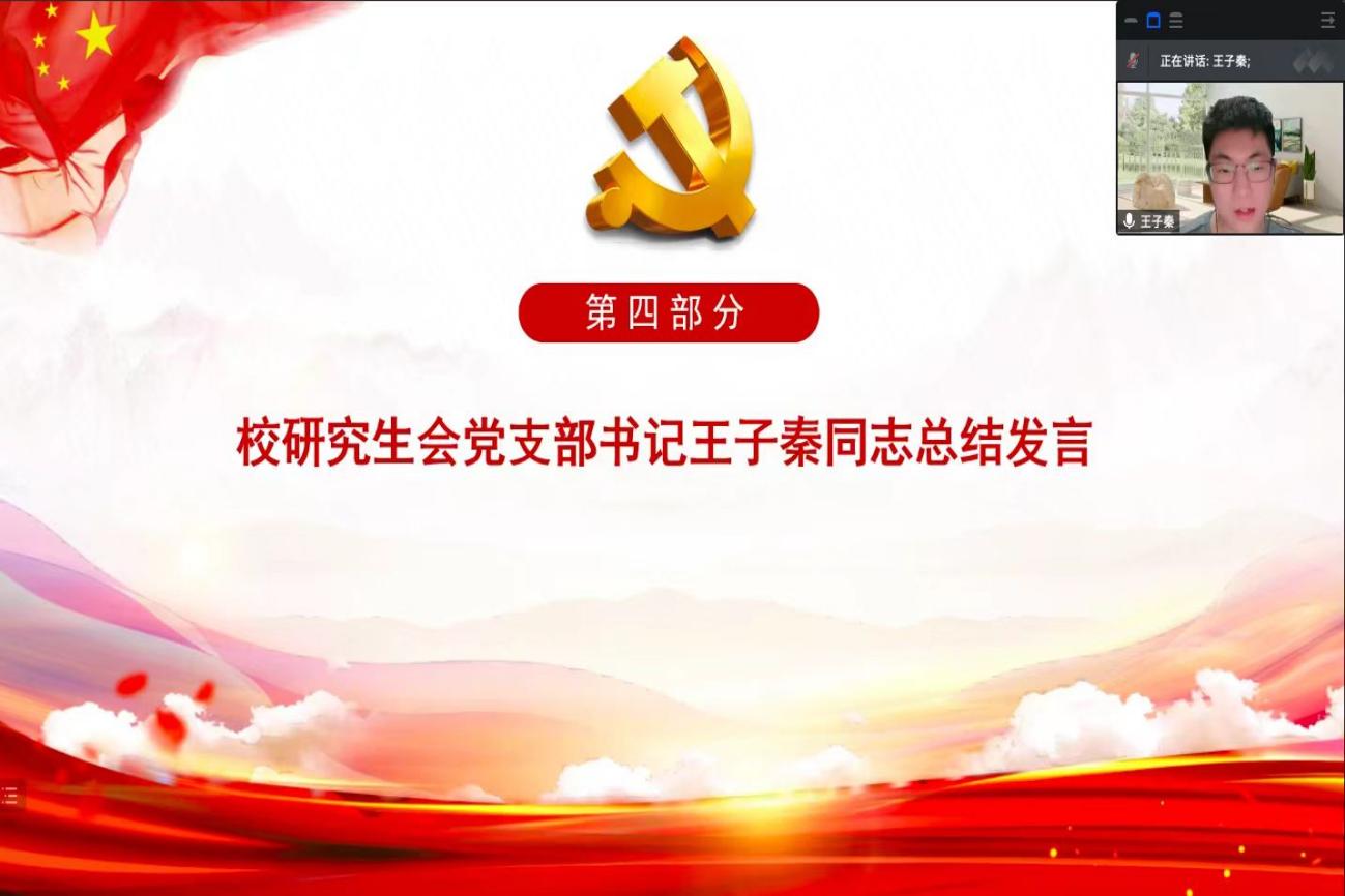 活动最后,校研究生会党支部书记王子秦同志总结发言。王子秦同志首先对前三位发言人的阐述表示感谢并作了总结并就如何学习和贯彻党章提出了四点倡议。第一,要认真地学习党章。学习党章是我们党员应尽的义务,这也是党员的基本功课。我们不仅要做到知其然,更要知其所以然。第二,要严格地去遵守党章。党章作为党的百年奋斗重大成就和历史经验,为全党确立了最基本、最重要、最全面的行为规范,遵守党的章程,是成为一名合格共产党员的基本条件,也是每名共产党员向党组织做出的庄严承诺,每个人必须在工作和生活中自觉用党章统一自己的思想、规范自己的言行,使党章内化于心、外化于行。第三,要切实贯彻好党章。全党贯彻党章的水平,决定着我们党员队伍党性修养的水平,也决定着全面从严治党的水平。我们要把党章的各项规定落实到行动上,落实到各项事业当中。最后,要坚决地维护党章,要坚决维护党章权威,做党章的坚定执行者和忠诚捍卫者,维护党章权威就是维护全体党员的共同意志,就是维护党的权威。