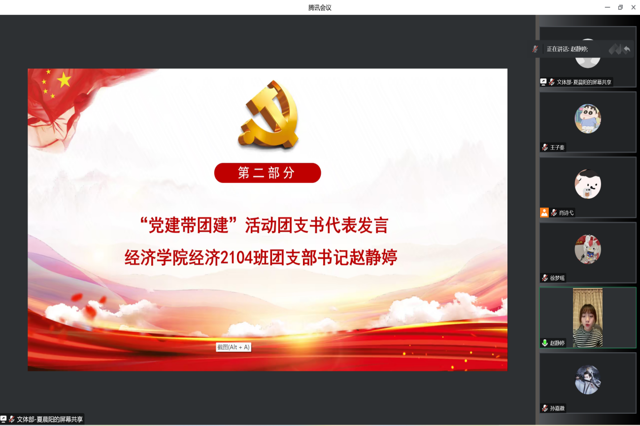 活动的第二项,“党建带团建”活动团支书代表、经济学院经济2104班团支部书记赵静婷发言。她结合之前开展团日活动中邀请党员同志参与的活动经验,指出党员参与到团日活动,能为团支部建设带来有益的指导,也充分发挥了党员的先锋模范作用,增强了支部共建合力,让支部更多团员更加坚定了向党组织靠拢的决心。最后她表示会坚持与对接党小组加强沟通互助,创新活动模式,将党团携手共建作为支部特色活动不断向更高质量推进。
