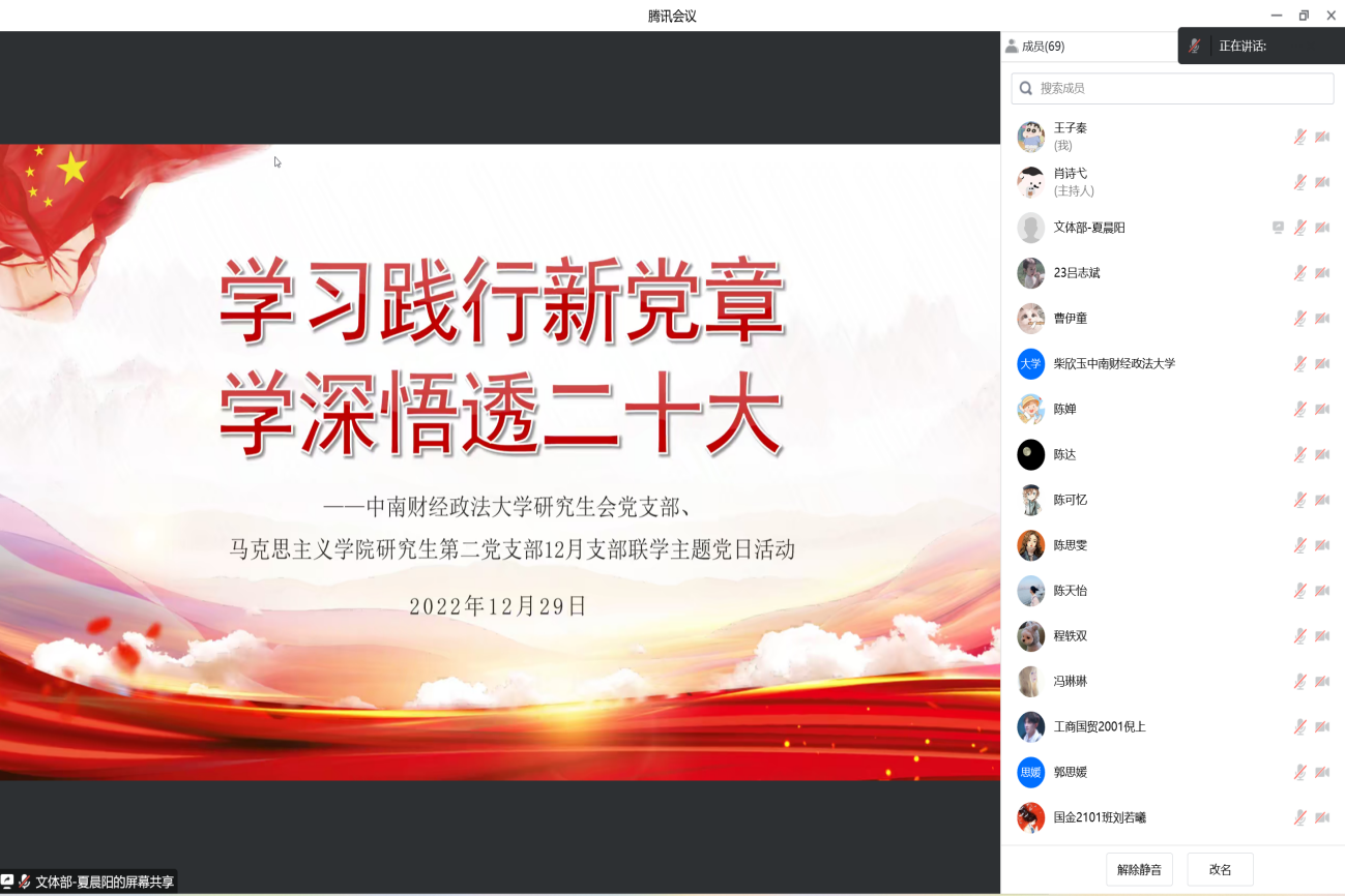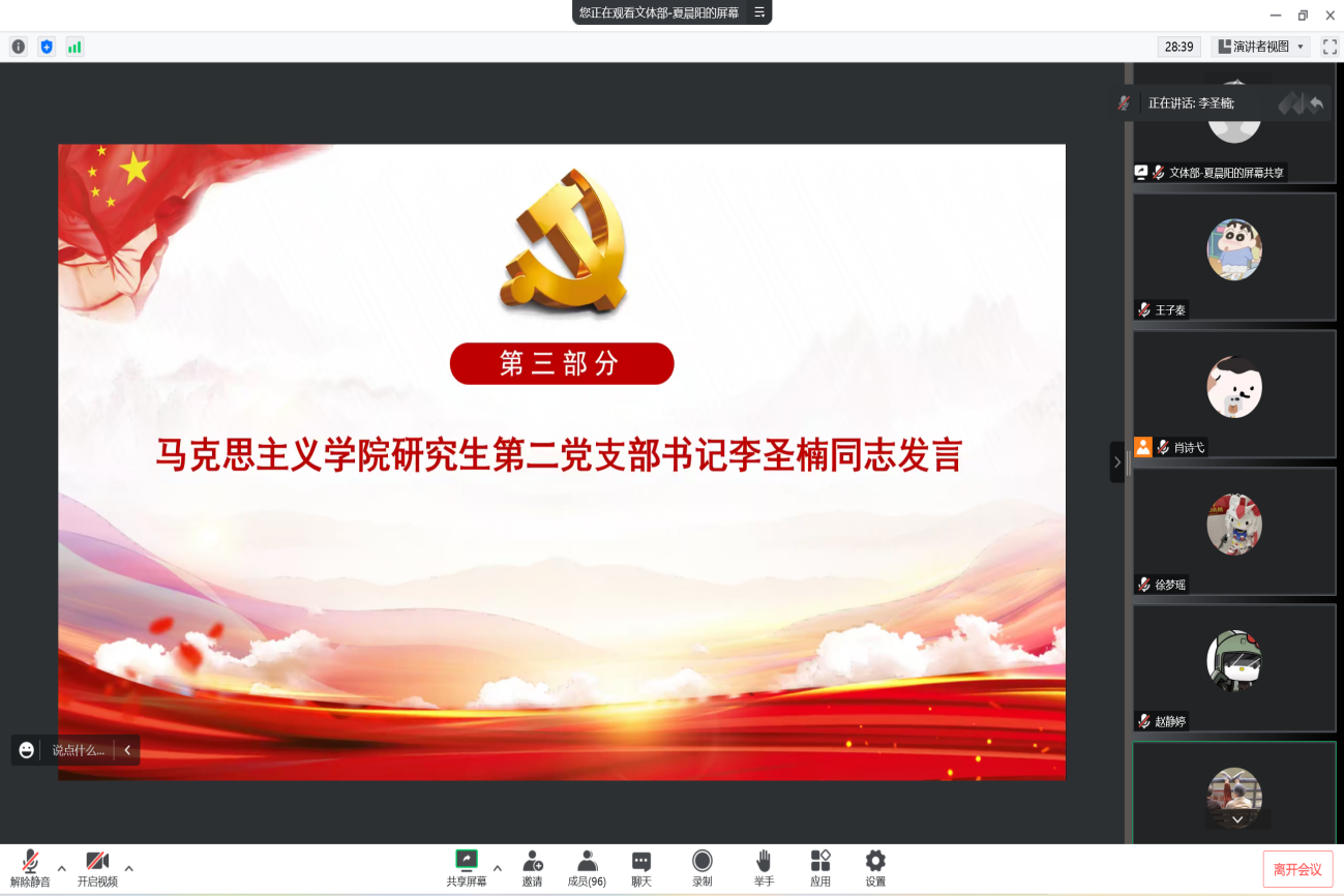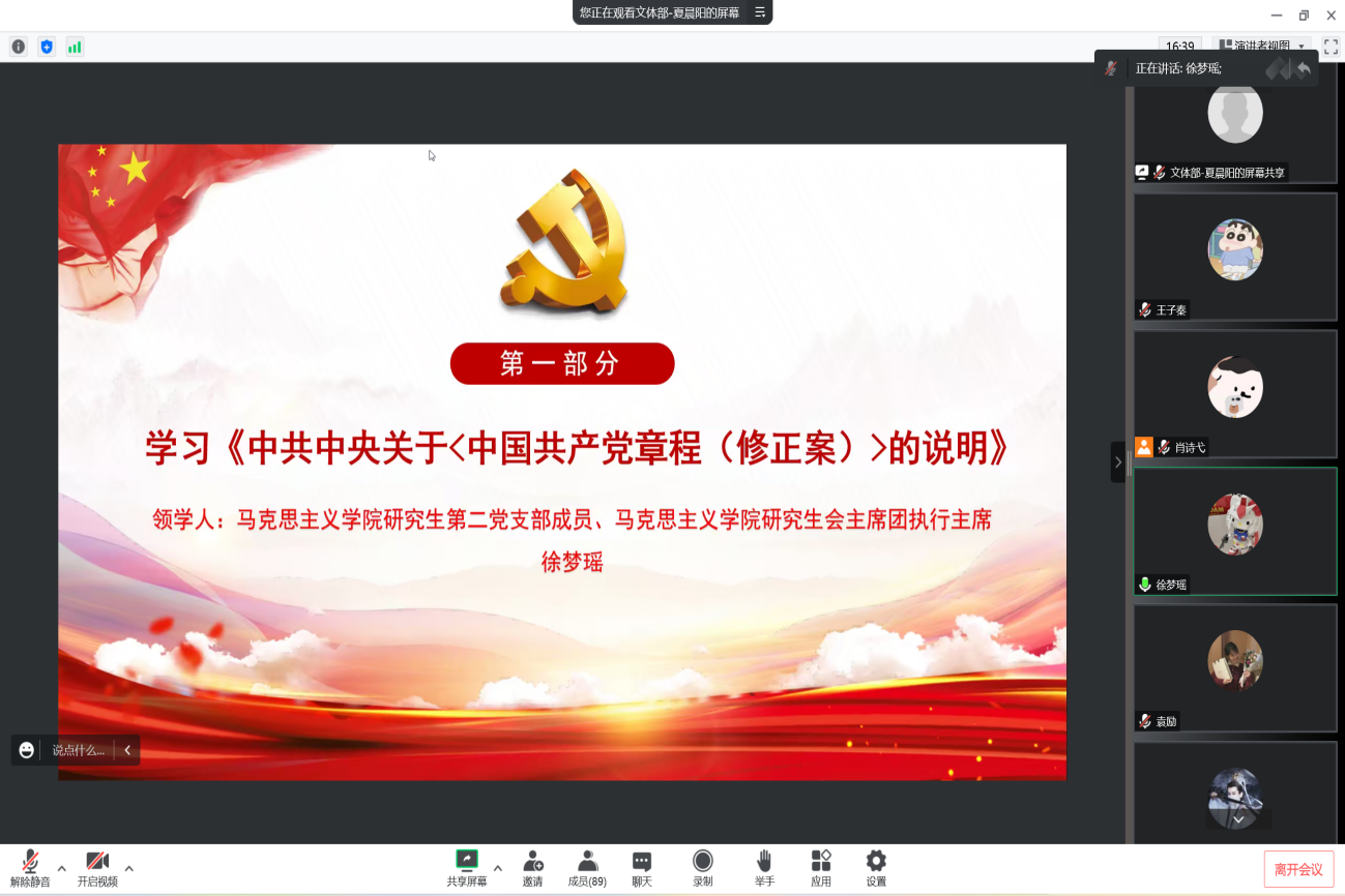 (通讯员 李倩 王子秦 摄影 余姝婷)为进一步推动党的二十大精神入脑入心、走深走实、见行见效,深入把握党章修改的工作过程和主要内容,深刻领会党章修改部分的重大意义,切实增强党员身份意识、履行党员责任义务,12月29日晚,校研究生会党支部与马克思主义学院研究生第二党支部在线上联合开展了主题为“学习践行新党章,学深悟透二十大”的12月支部联学主题党日活动。校研究生会党支部全体成员、马克思主义学院研究生第二党支部全体成员以及各学院团支部代表共同参加会议。会议由校研究生会党支部成员夏晨阳同志主持。
