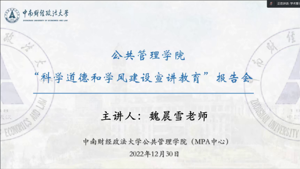 (通讯员 魏晨雪 郑琪琦)2022年12月30日晚上18:30,由中南财经政法大学研究生院、党委研究生工作部、中南财经政法大学研究生会主办,中南财经政法大学公共管理学院(MPA中心)研究生会承办的“科学道德与学风建设宣讲教育”报告会于线上成功举办。本次讲座特邀公共管理学院魏晨雪老师担任主讲嘉宾,公共管理学院全体研究生线上参会学习。讲座由公共管理学院研究生会学术部干事陈宁同学主持。
