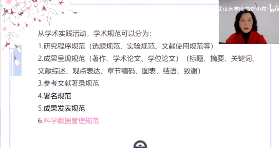报告会上,魏晨雪老师以“坚守学术底线,传承高洁学风”为主题,从“系好学术生涯第一粒扣子”、“学术不端行为的类型及危害”和“我校学术规范及学位论文质量管理措施”三个环节展开报告。报告伊始,魏晨雪老师为大家播放武汉大学图书馆的讲座视频引入学术不端行为这一话题,该视频从科学精神与学术道德、学术规范及案例分析、科学伦理及案例分析、学术不端预防与规制四个方面进行了详细阐述。