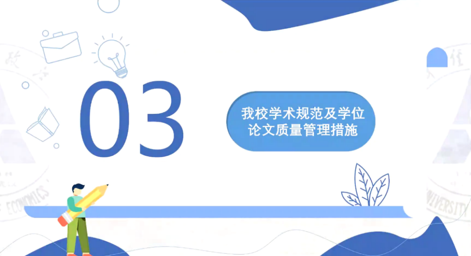 随后,魏晨雪老师结合我校相关文件为同学们介绍了有关学术规范与学位论文质量管理的措施与规定。针对研一、研二的同学,尤其是刚结束第一学期课程的研一同学,在面临很多考核方式是论文的期末考试,魏老师强调根据我校2019年出台的文件细则,每年研究生院会对研究生课程考试试卷进行抽检,所以同学们写完课程论文一定要使用知网系统进行查重,且查重率需要低于15%;针对研三的同学,魏老师强调了学位论文撰写过程中需注意的规范细节,如参考文献与脚注的区别,同时着重强调了对论文提交时间、盲评时间、查重机会、论文查重率等把握的重要性和学术不端后果的严重性。