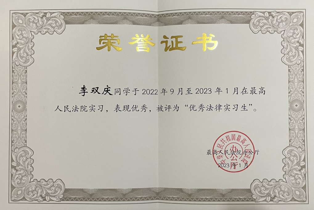 2023年1月,最高人民法院第十一批法律实习生项目圆满结束,经各实习单位评审、推荐,我校法学院诉讼法专业2021级硕士研究生李双庆荣获由最高人民法院办公厅、政治部、机关党委组织评选的“优秀法律实习生”荣誉称号。据悉本批来自全国法律院校实习生共遴选出70名,实习期为2022年9月至2023年1月,为期四个月。