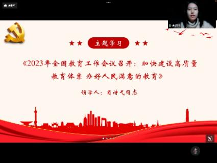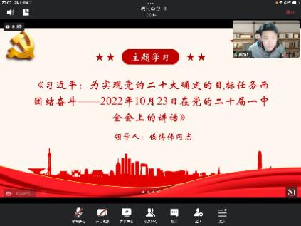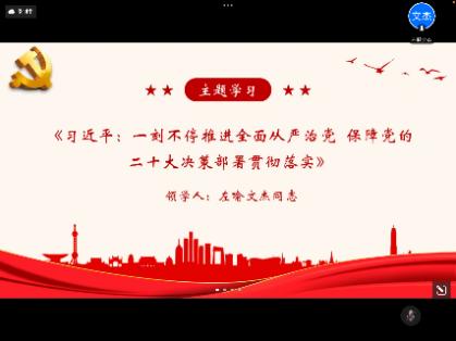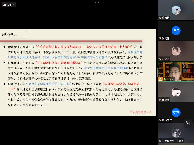 活动第一项为主题学习。纪律委员侯博伟同志、组织委员左喻文杰同志和支部副书记肖诗弋同志先后领学了《习近平:为实现党的二十大确定的目标任务而团结奋斗——2022年10月23日在党的二十届一中全会上的讲话》《习近平:一刻不停推进全面从严治党 保障党的二十大决策部署贯彻落实》《2023年全国教育工作会议召开:加快建设高质量教育体系 办好人民满意的教育》等文件。党员代表们表示,2023年是全面贯彻落实党的二十大精神的开局之年,是实施“十四五”规划承上启下的关键一年,作为校级研究生干部,尤其是青年研究生党员,要深刻领悟“两个确立”的决定性意义,坚决做到“两个维护”,在学习工作中扎实开展主题教育学习,推进党的二十大精神入脑入心、走深走实、见行见效。