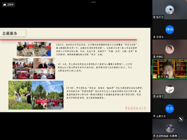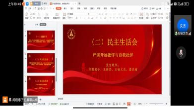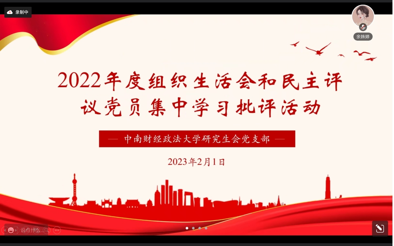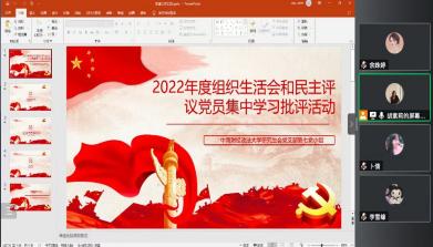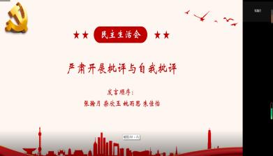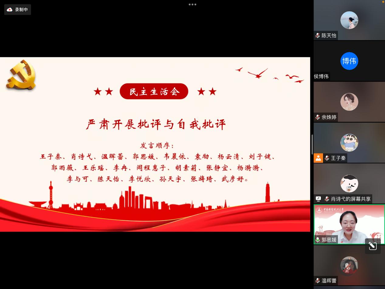 2月1日晚,校研究生会党支部支委、校研究生会主席团及职能中心负责人、支部各党小组组长在线上开展了2022年度组织生活会和民主评议党员集中学习批评活动。活动由宣传委员余姝婷同志主持。