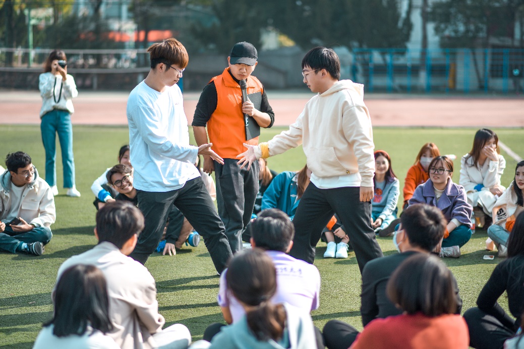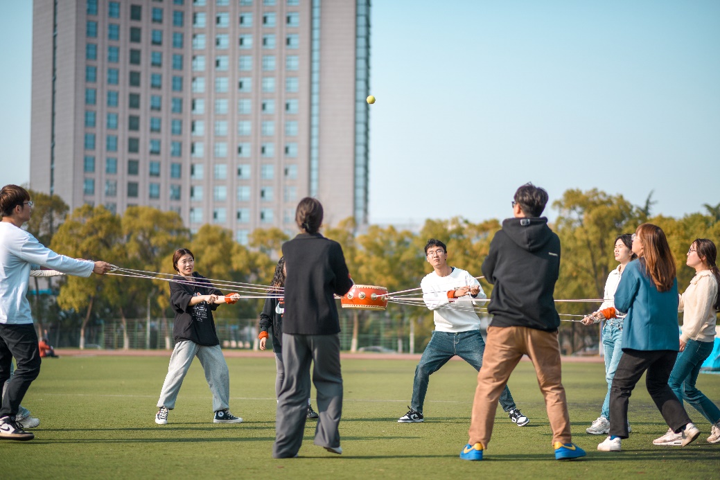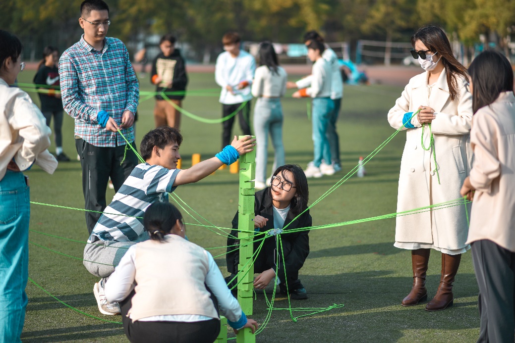 操场上,青春洋溢,欢呼声、呐喊声此起彼伏。经过简单的热身运动后,大家被随机分成红、橙、蓝、绿四支队伍,并在专业教练的指导下,相继开展了“鼓动人心”“挑战150”“合力筑塔”“指压板大挑战”等团建活动。在考验团队协作能力的“鼓动人心”游戏中,大家一人拉一根绳子,一起把中心大鼓支撑起来,完美达成连续颠球成就;在充满趣味性的“挑战150”游戏中,各组成员通过“解手链”“逢三过”“一圈到底”三个子活动,紧密配合,实现默契度的快速提升;在紧张又惊险的“合力筑塔”游戏中,大家合力操控绳子控制吊板,小心翼翼地用吊板上的钩子将地面上的盒子竖直叠到一起;在最受欢迎的“指压板大挑战”游戏中,参赛队员一边努力适应指压板带来的刺激感,一边相互鼓励完成随机发布的多重挑战,将现场气氛推向高潮。一系列团队竞技协作活动充分展现了我校研究生齐心协力、积极进取的精神风貌。