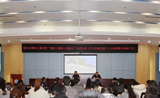 随后,余先亭为全校政工干部做辅导员理论大讲堂暨“培根•铸魂•育新人”书记沙龙(学习贯彻党的二十大精神集中轮训工作)专题报告。余先亭从高校的责任与使命、大学生思想政治教育面临的困难与挑战、辅导员队伍建设以及教师思政工作四个方面进行详细辅导。他指出,高等学校要扎根中国大地,加强党对高校的全面领导,将把准办学方向、瞄准办学目标、承担办学使命落到实处。现阶段高校思想政治工作必须紧跟时代变化、形势变化、环境变化,主动立足百年未有之大变局,绵绵用力,久久为功。面对00后大学生,既要把握思想政治工作规律,又要把握大学生成长成才规律,特别是要关注重点学生群体,加强人文关怀和心理疏导,培养担当民族复兴大任的时代新人。同时,余先亭肯定了辅导员在思想政治工作中发挥的重要作用,鼓励辅导员走好专业化、职业化发展道路,提升职业归属感,并指出高校要进一步加强教师思想政治教育能力培养,真正落实好“三全育人”的具体要求。