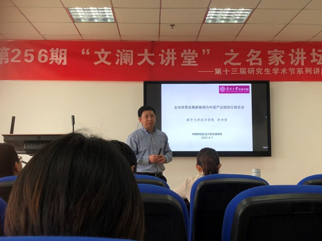 (通讯员 戴思维 张旖琦)2023年4月7日下午14: 30,由中南财经政法大学研究生院、党委研究生工作部、中南财经政法大学研究生会主办,文澜学院研究生会承办的第256期“文澜大讲堂”之名家讲坛系列讲座在文澴楼709教室顺利举办。本次讲座邀请到南开大学经济学院教授李坤望作为主讲嘉宾,带来了“全球贸易发展新格局与中国的产业链供应链安全”专题分享,旨在提升同学们对全球贸易发展新格局和中国的产业链供应链安全的认识,以科学理论引导学生扩散思维、探索学科前沿思想。文澜学院全体21、22级硕士、博士研究生参加本次讲座。