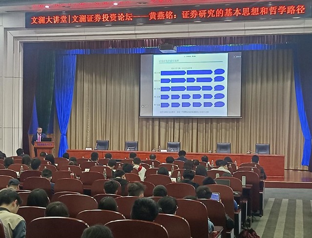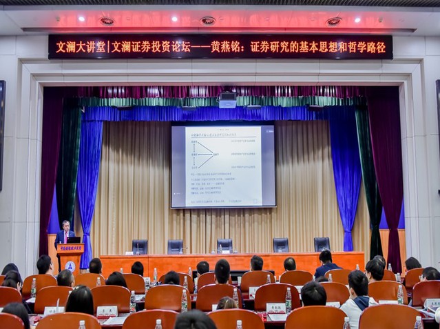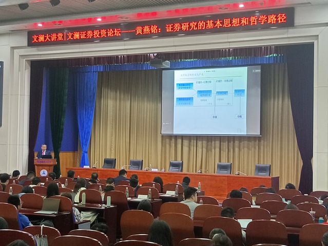 黄燕铭所长用一个看似俗气但蕴含哲理的题目“股票价格为什么会涨跌?”为引展开了本次的名家讲坛。他将证券投资比作一个参悟智慧的过程,并强调在这个过程中读教材、读学科发展史、读行业发展史和读文献的重要性。通过将研究证券的境界分成五个层级,解释了层级之间的特点和研究方法上的差异,加深了在场师生对业界证券研究更深层次的理解。