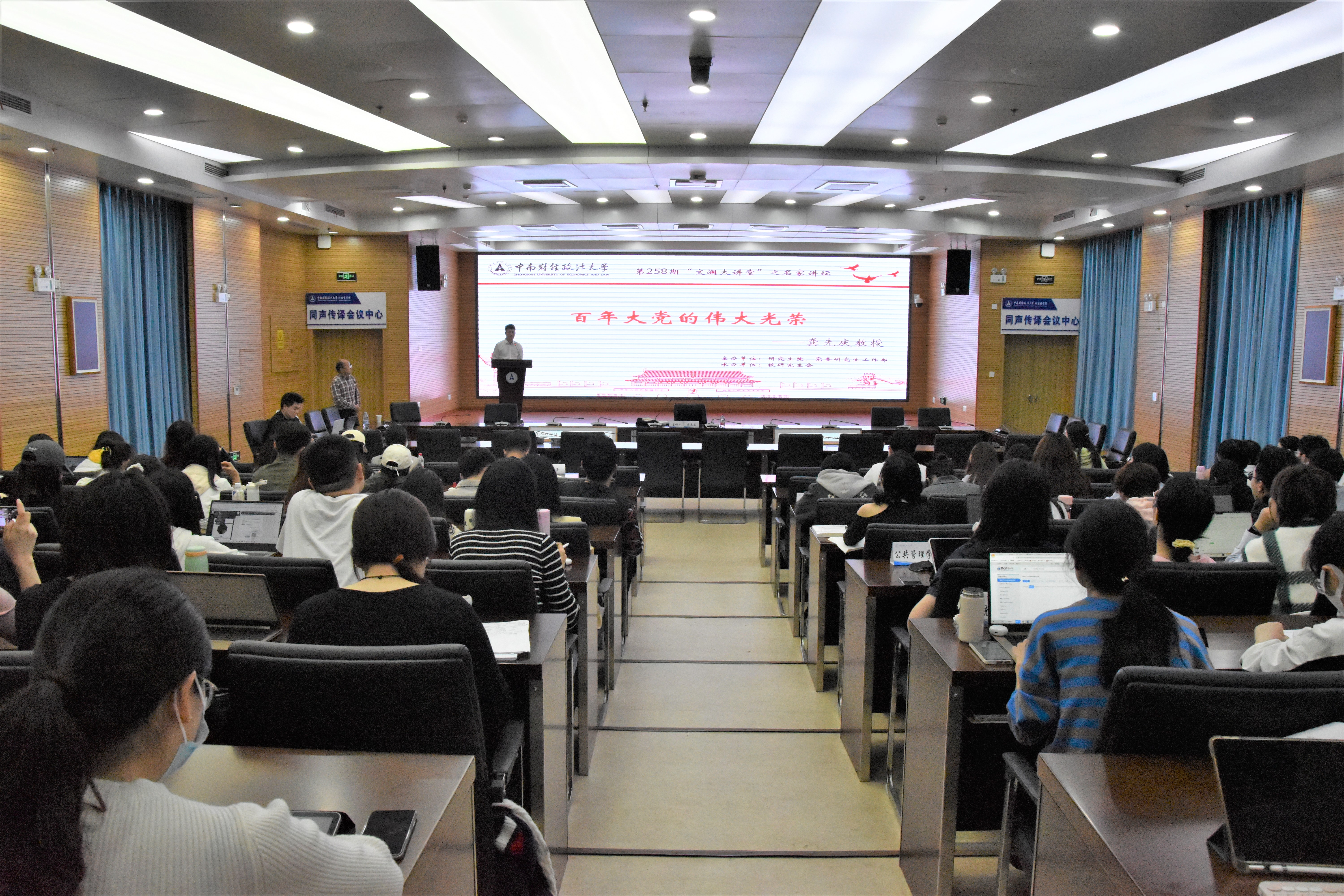 (通讯员 付慧娟 韦晨依 吴润泽 胡雪涵 摄影 李悦欣)为进一步深入学习宣传贯彻习近平新时代中国特色社会主义思想和党的二十大精神,切实加强研究生思想政治教育工作,2023年4月13日下午,党委研究生工作部特邀马克思主义学院龚先庆教授做客258期“文澜大讲堂”,于文澴楼同声传译会议中心为广大研究生作“百年大党的伟大光荣”党建专题报告会。党委研究生工作部白玉副部长、研究生思想政治教育办公室付慧娟老师出席报告会,16个学院(中心)百余名研究生代表现场聆听报告。