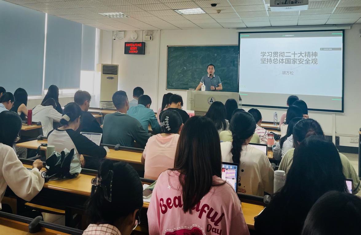 胡万松副教授重点讲述了二十大报告的深刻内涵以及二十大报告中有关国家安全观的内容。首先,他为同学们梳理了二十大报告的主要内容,通过比较中西方两种发展模式在第三世界国家应用的情况,进而强调了二十大报告中坚定“四个自信”的重要意义。同时,他进一步解读了中国式现代化的丰富内涵。接着,胡教授又从二十大报告出发,阐述了他对国家安全的理解。他从当今世界格局以及近十年中国周边国际形势出发,引导同学们进行战略性思考,提出强大国力军力,实现中华民族伟大复兴的国家安全愿景。胡教授的讲述站位高远、内容翔实、生动有趣,同学们聆听认真,受益匪浅。