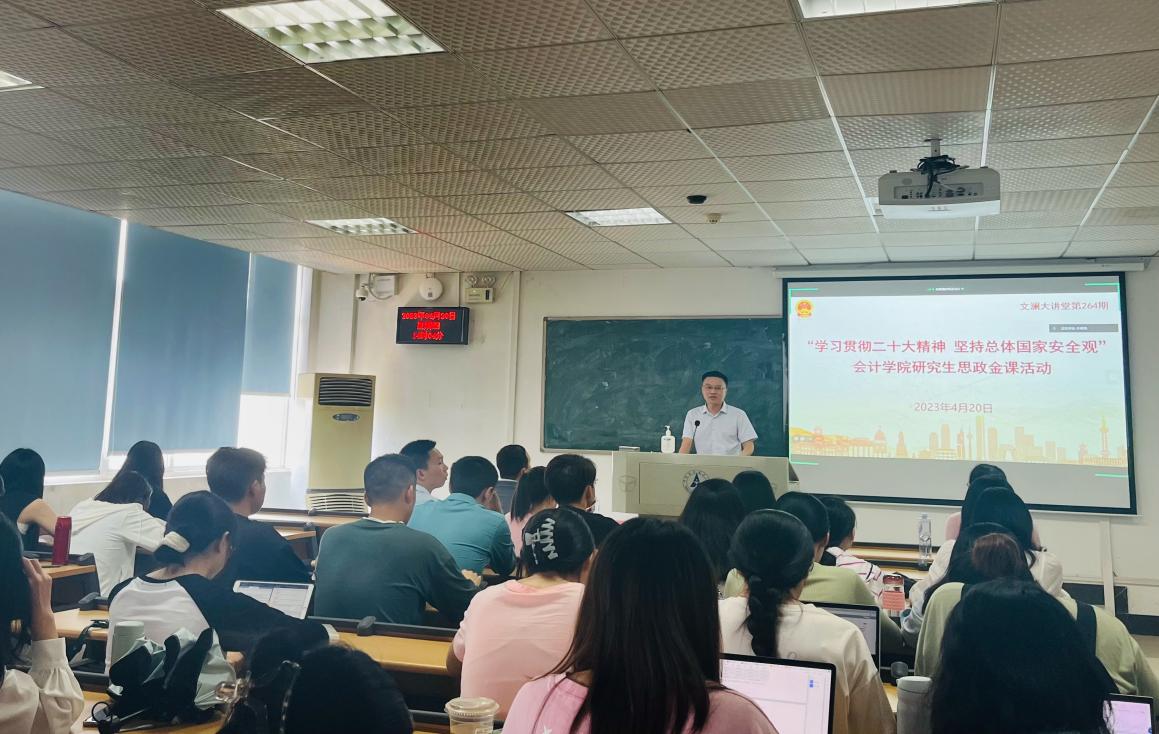 (通讯员 王雯慧)4月20日下午,由会计学院承办的第264期“文澜大讲堂”暨新时代研究生思政金课在文添楼501顺利举行。全国国防教育专业委员会委员、全国国防教育联盟理事会理事、我校军事教研室主任胡万松副教授为我院研究生做了主题为学习贯彻二十大精神,坚持总体国家安全观的报告。会计学院党委副书记、纪委书记兼行政副院长徐会超出席活动并致辞。活动由会计学院研究生工作办公室主任张昭妍主持。