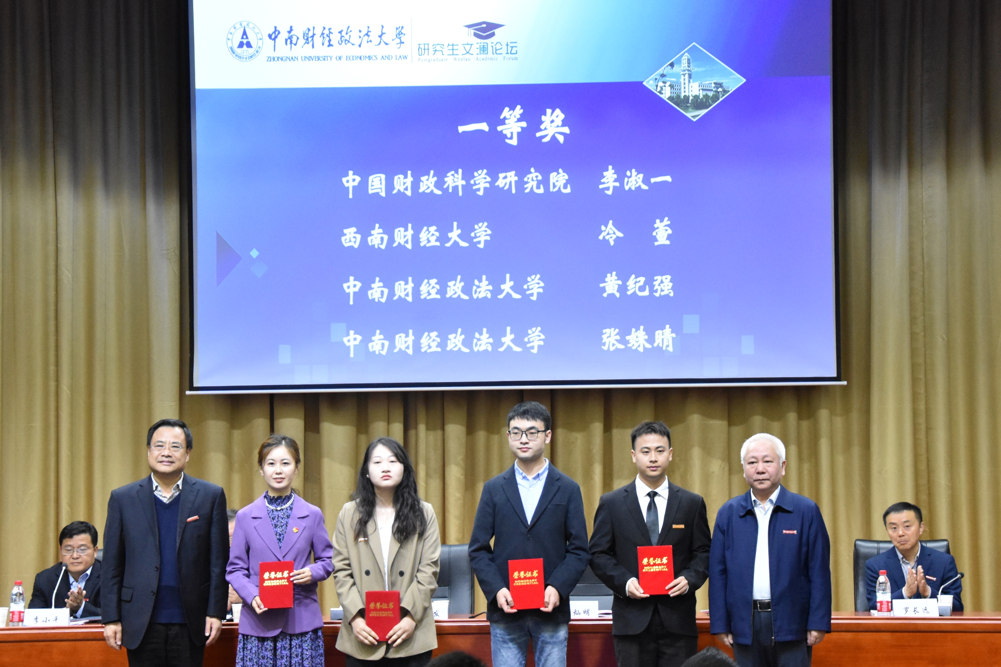 在颁奖环节,校党委书记侯振发教授、校长杨灿明教授为一等奖获奖作者颁奖,副校长姚莉教授为二等奖获奖作者颁奖,特邀嘉宾复旦大学罗长远教授、论坛评审委员会代表李小平教授、党委办公室、学校办公室刘建明主任、研究生院院长胡弘弘教授、党委研究生工作部肖翠祥部长分别为三等奖和优秀奖获奖作者颁奖。
