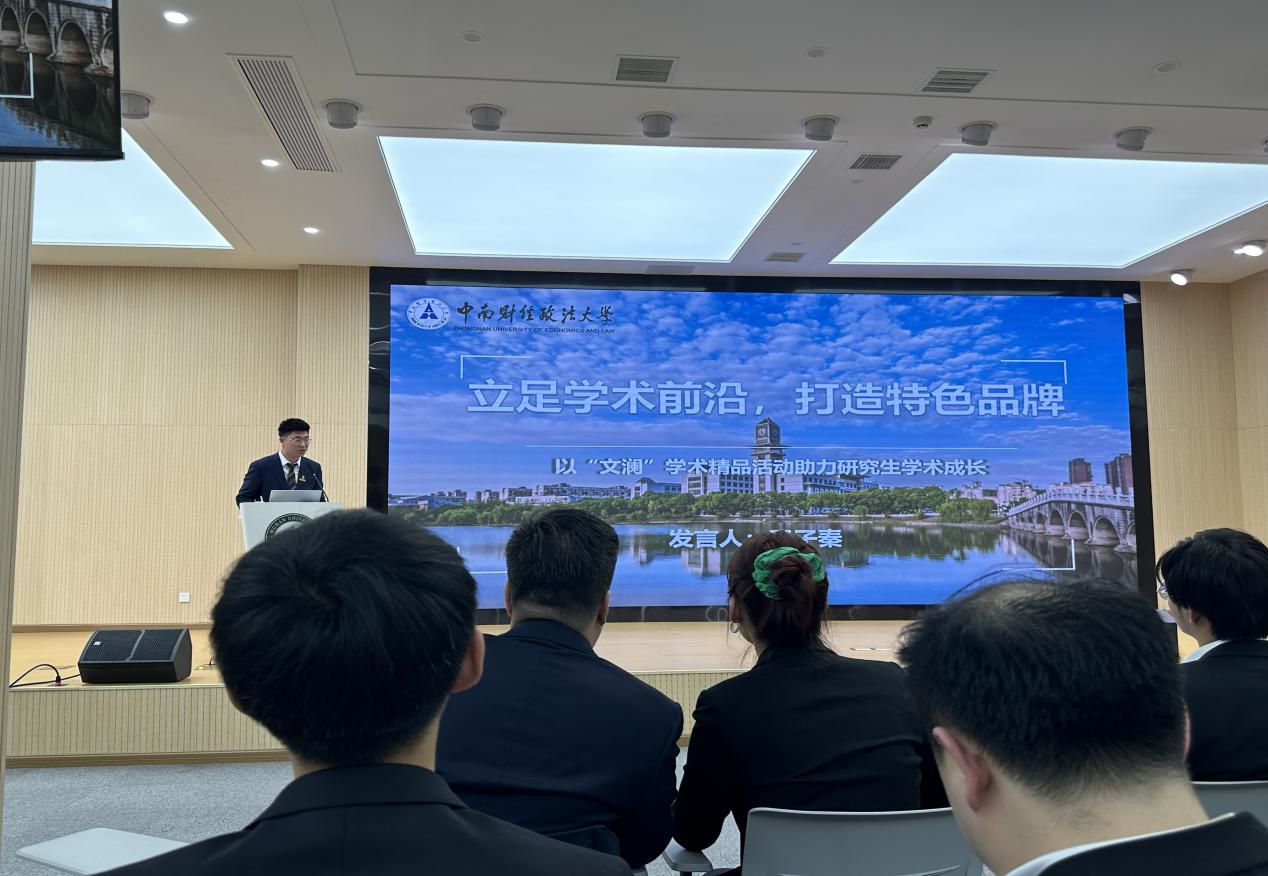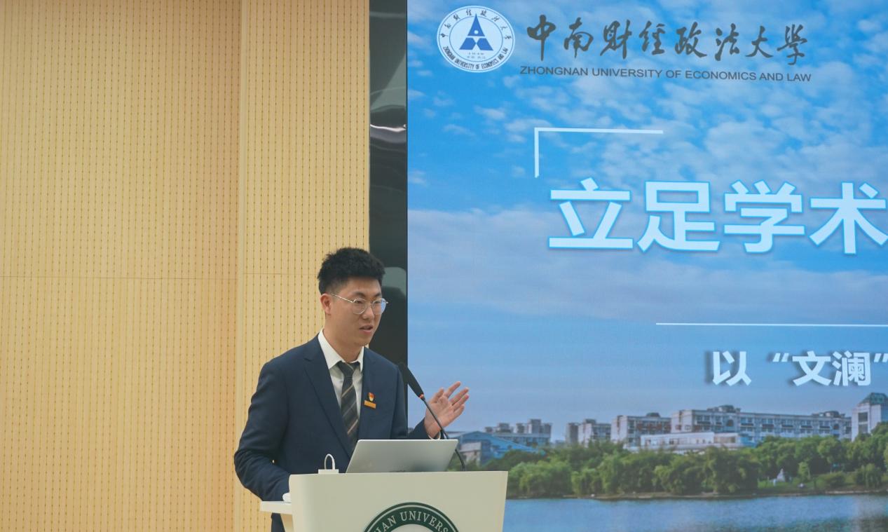 4月22日下午,研讨会主论坛在武汉大学工学部大学生活动中心举办。各高校研究生骨干代表围绕“‘研’论科创报国——以青春之我投身学科建设最前沿”这一主题,结合所在高校研究生会工作实际,分享了在服务同学学术科研发展和学校学科建设方面的具有亮点特色和典型性的措施。我校研究生团工委副书记(学生)、研究生会主席团成员王子秦以“立足学术前沿,打造特色品牌,以‘文澜’学术精品活动助力研究生学术成长”为题,从研会情况、研究生学术节、研究生“文澜论坛”、文澜大讲堂四个方面,介绍了我校以“文澜”学术精品活动助力研究生学术成长的特色做法。