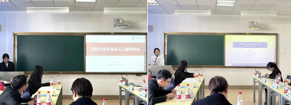 首都经济贸易大学的博士研究生尚佳佳就其论文《宗族文化与流动人口城市创业》进行观点阐释,她指出城市开放可以有效削弱宗族文化对流动人口创业的影响,帮助流动人口实现长期创业效果。中南财经政法大学硕士研究生周文倩分享了题为《工业机器人与中国省际收入不平等——基于结构模型的量化分析》的论文,文章基于动力跨区域迁移和开放性框架,揭示了工业机器人对改变中国收入不平等格局的机遇和挑战。